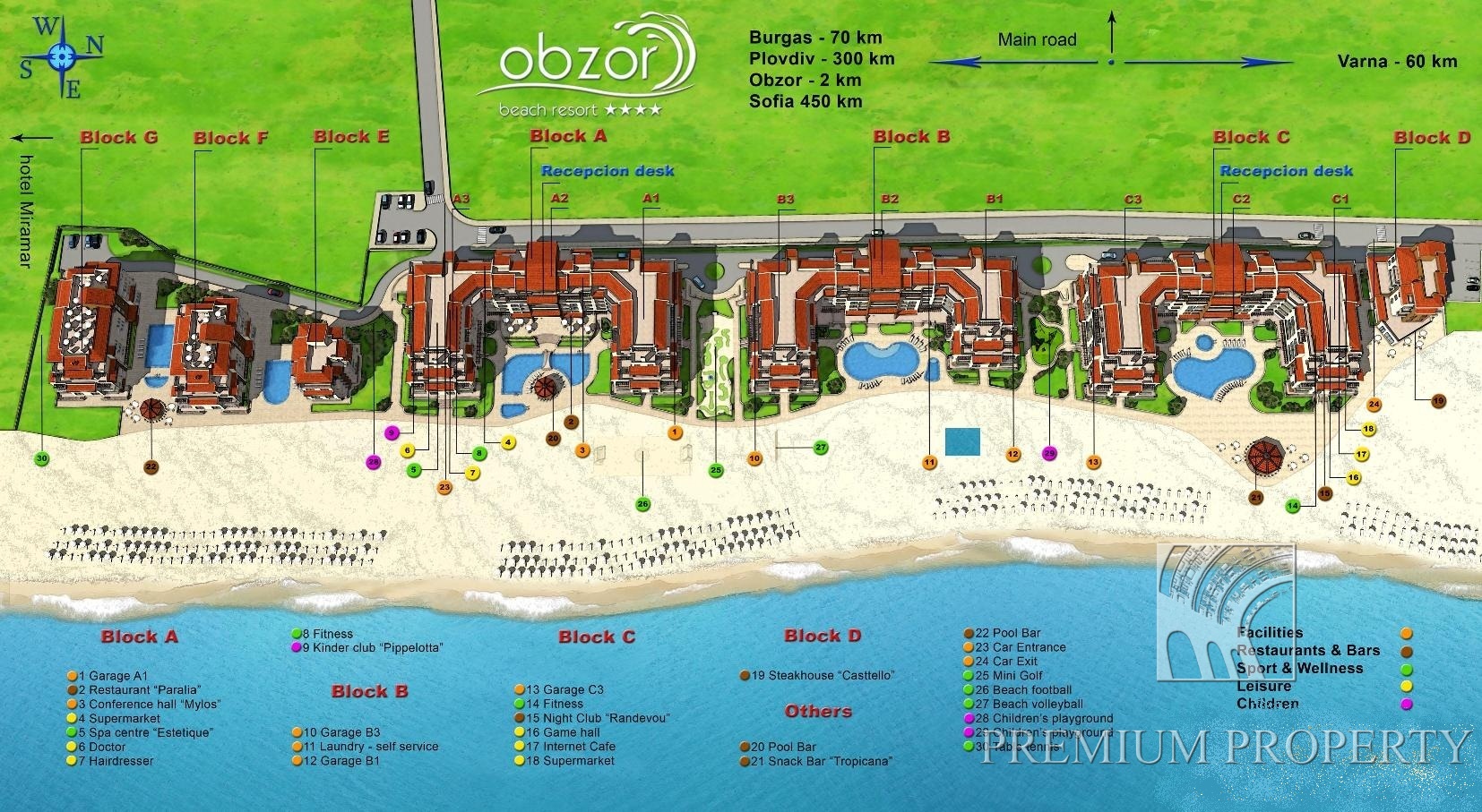 Обзор Бич Резорт (Obzor Beash Resort) – уникальный комплекс апартаментов с развитой инфраструктурой расположенный на первой линии прекрасного песчаного пляжа в городе Обзор. Обзор находится на болгарском побережье примерно посередине между Бургасом и Варной. Он протянулся вдоль берега в очень живописной местности, с одной стороны открывается великолепный вид на море, а с другой на горы. Свежий горный воздух, чистая родниковая вода и чудесный пляж длиной 7 км. и шириной 60-70 метров с мелким золотистым песком. Комплекс Обзор Бич Резорт состоит из 550 современно меблированных апартаментов, каждый из которых имеет душ/туалет, телефон, спутниковое ТВ, холодильник, фен, балкон. Только 8 апартаментов имеют вид на парк, а все остальные с видом на море. Каждая квартира располагает уютной гостиной с полностью оборудованной кухней, кондиционеры в каждой жилой комнате.