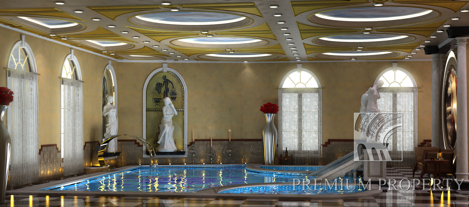 Главное фойе Артура оформлено как центр композиции, подчеркнутое внушительной закрученной лестницей, украшенной кованым железом. С фойе можно пройти в стильный cпа центр оборудованный внутренним бассейном, украшенный кассетным потолком с невероятными картинами русской классики. Со всех сторон веет изысканной роскошью и умело сбалансированными пропорциями. Этот бассейн является частью ансамбля Спа центра для восстановления и релакса. В него включены обширный фитнес зал, русская и турецкая бани. Внутренний бассейн визуально связан и с внешним бассейном, целенаправленно искомые в одной композиционной оси.