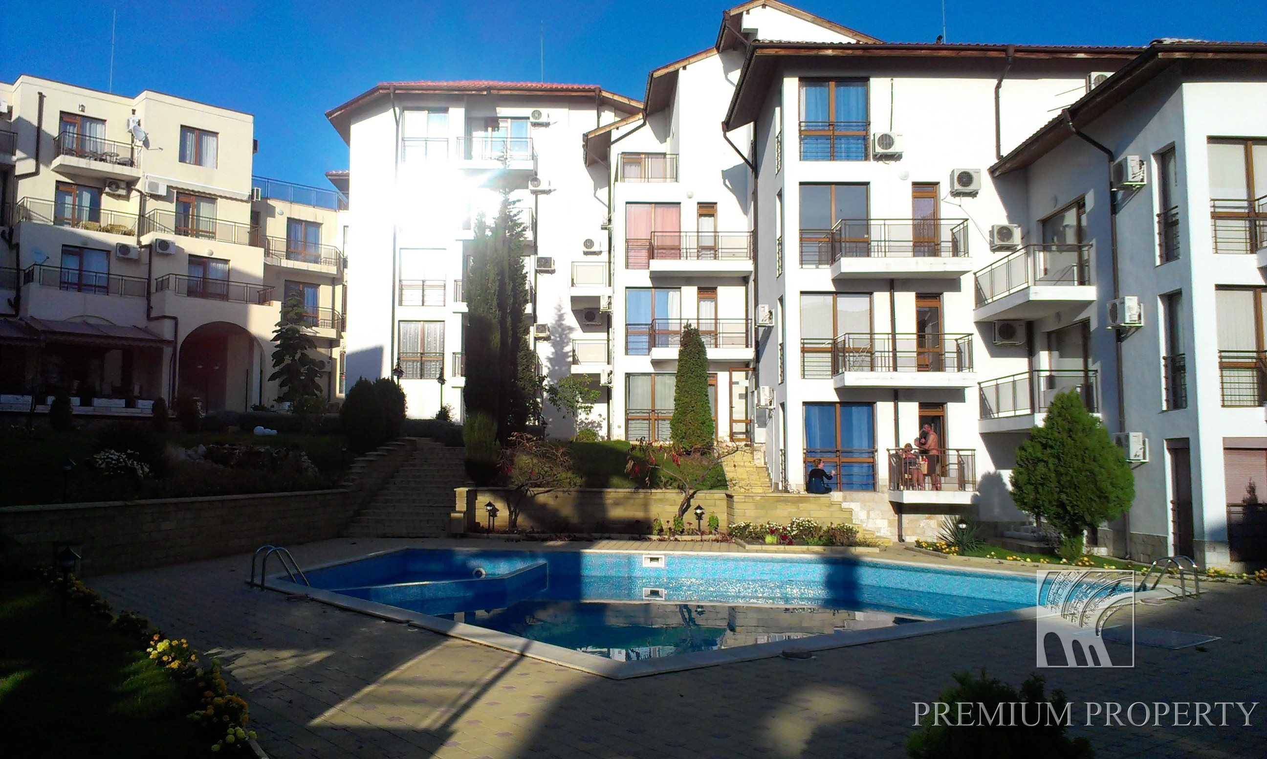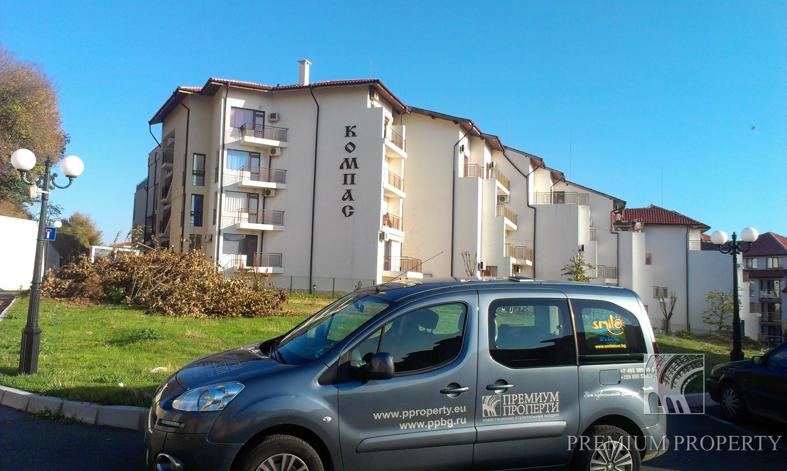 Комплекс Компас (Kompas) расположен в 150 м от берега моря на площади 6500 кв. м. и решен в современном архитектурном стиле с панорамными окнами - дверями в каждом апартаменте с видом на море. Он состоит из 7 жилых домов с собственным входом. В комплекс имеются апартаменты квадратурой от 43 до 156 кв. м. Более 50% жилищ являются собственностью иностранцев, преимущественно россиян, англичан, бельгийцев, ирландцев.